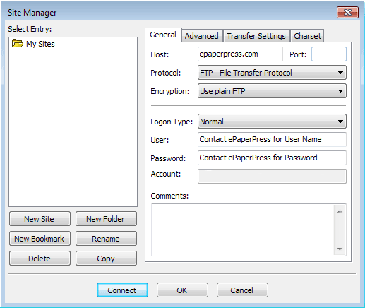 Use an FTP Client such as FileZilla Client (it's free and easy to use) to FTP files to ePaperPress. Choose File > Site Manager and configure as follows: